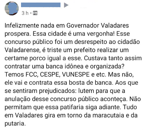 A empresa responsável pela organização do concurso, a MSM Consultoria e Projetos, de Teófilo Otoni (MG), informou que muitos fatos que estão sendo colocados (nas redes sociais pelos candidatos) não existem.