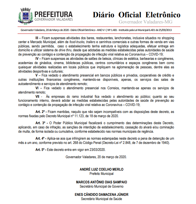 Vão continuar funcionando em Valadares supermercados, açougues, padarias, lojas de produtos veterinários, postos de gasolina (exceto lojas de conveniência), farmácias, laboratórios, clínicas, hospitais e outros serviços de saúde, distribuidoras de água mineral e gás de cozinha, empresas funerárias e de segurança privada.