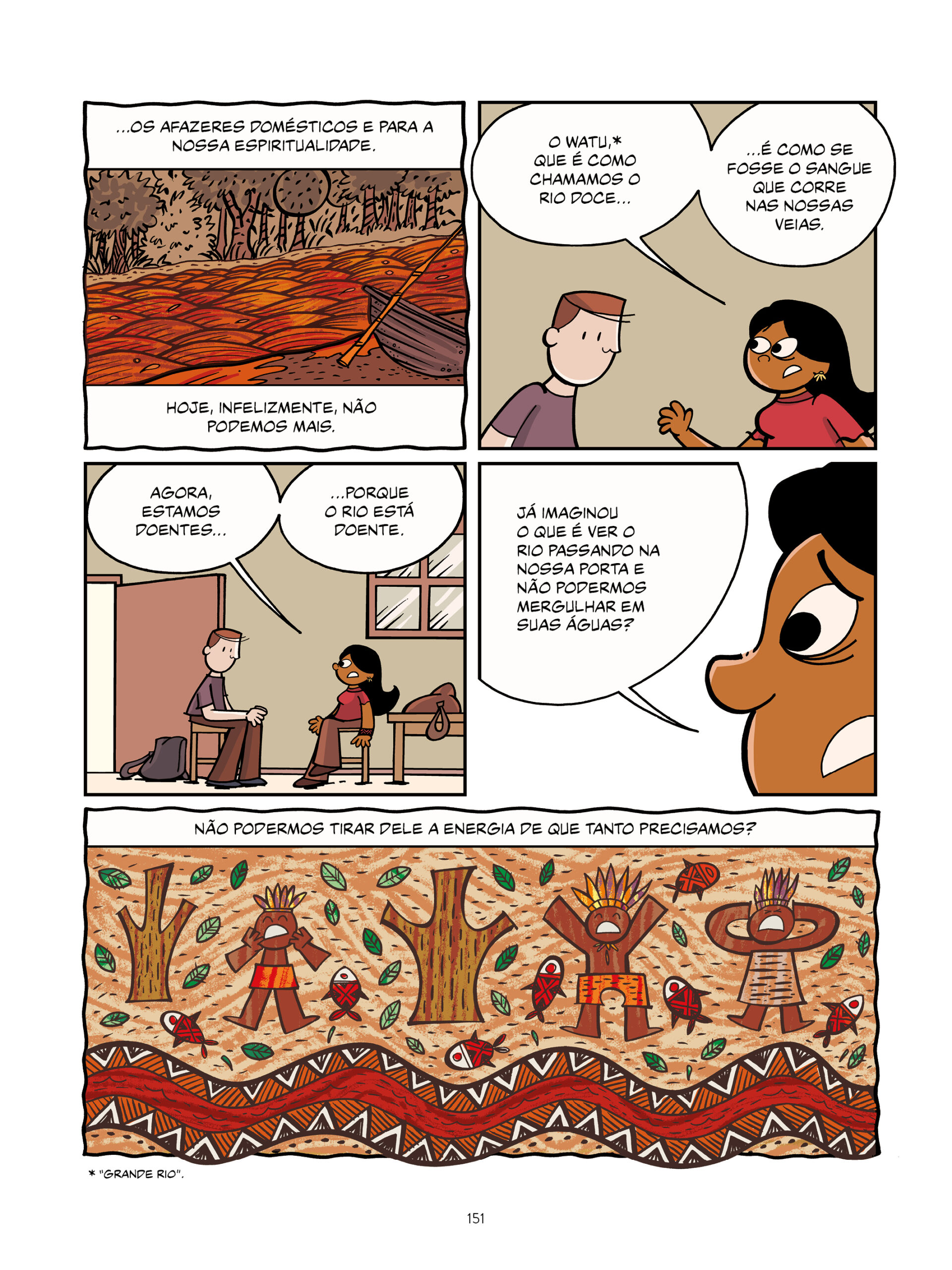 O traço do artista constrói uma narrativa que funciona como registro e como denúncia. As cores são de Marianne Gusmão, que utiliza diferentes tonalidades para representar a lama e suas consequências emocionais na vida das pessoas.